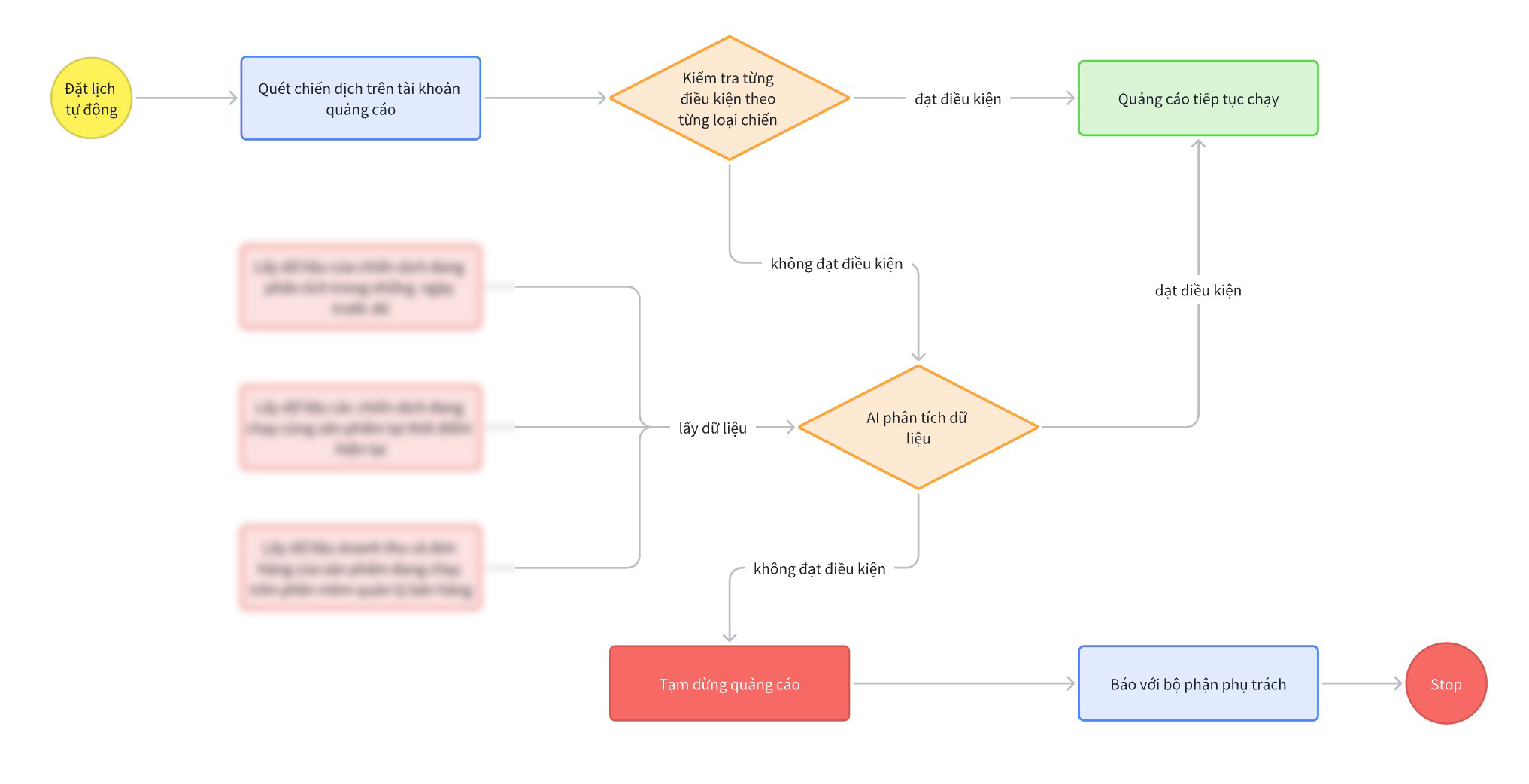 Template tự động tạm dừng các quảng cáo Facebook không hiệu quả, vượt ngân sách … theo các điều kiện có sẵn. Có thể kết hợp với các dữ liệu từ phần mềm quản lý bán hàng, lịch sử chi tiêu của chiến dịch trước đó và dữ liệu của các chiến dịch chạy cho sản phẩm đó trong thời điểm hiện tại. Kết hợp với các rule và AI để đưa ra quyết định tiếp tục hay tạm dừng quản cáo.